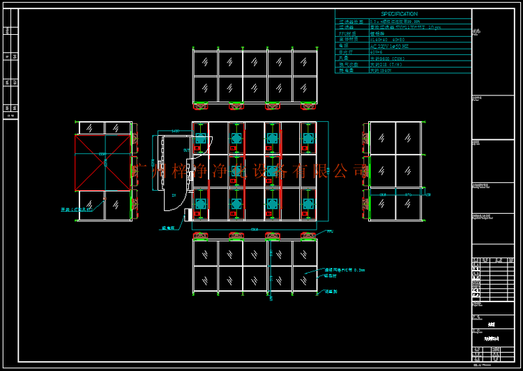 6.洁净棚由FFU风机过滤单元经初效过滤器进行第一道过滤,再经过高效过滤器第二道过滤后,整个出风面以匀速送出到洁净棚内,使洁净空气气流呈垂直单向流,保证工作区内所要求的洁净度。